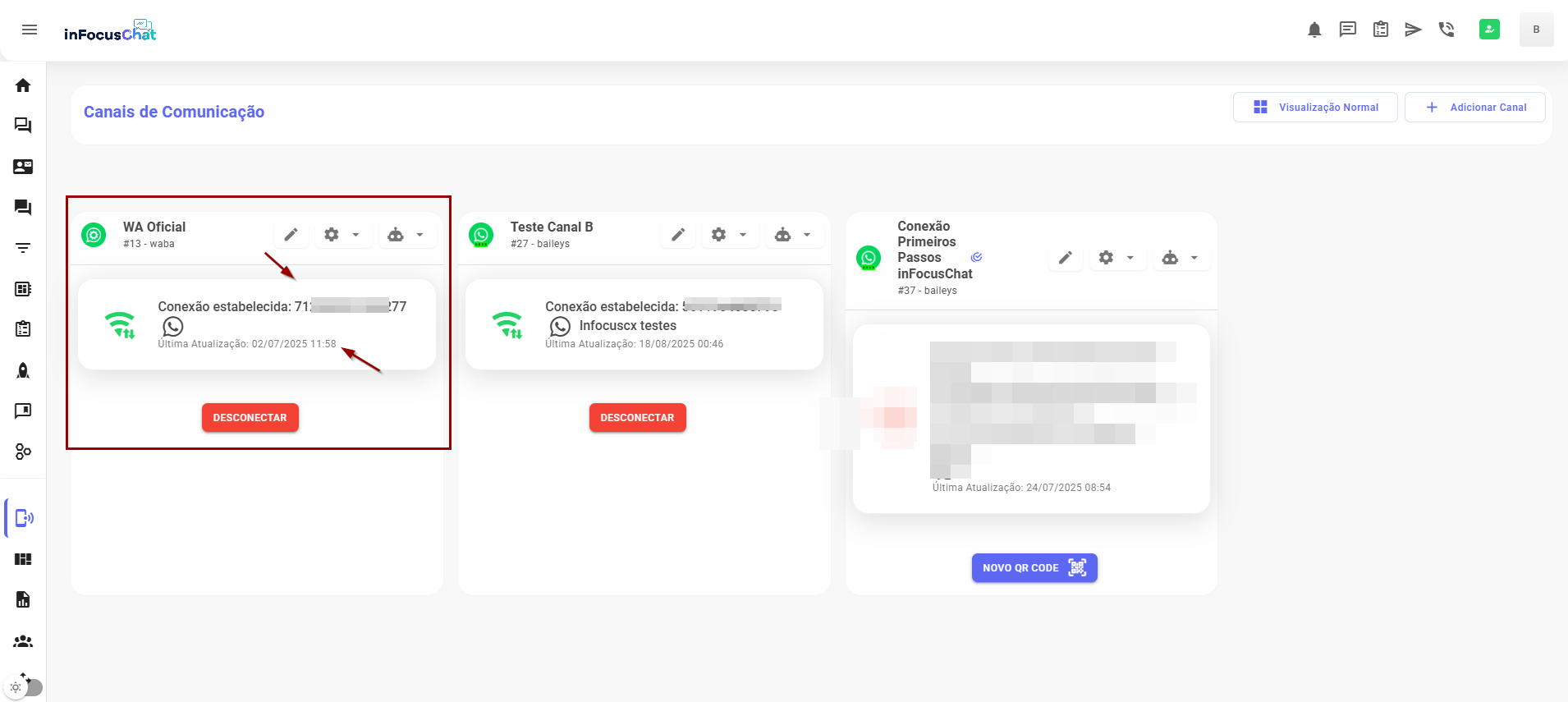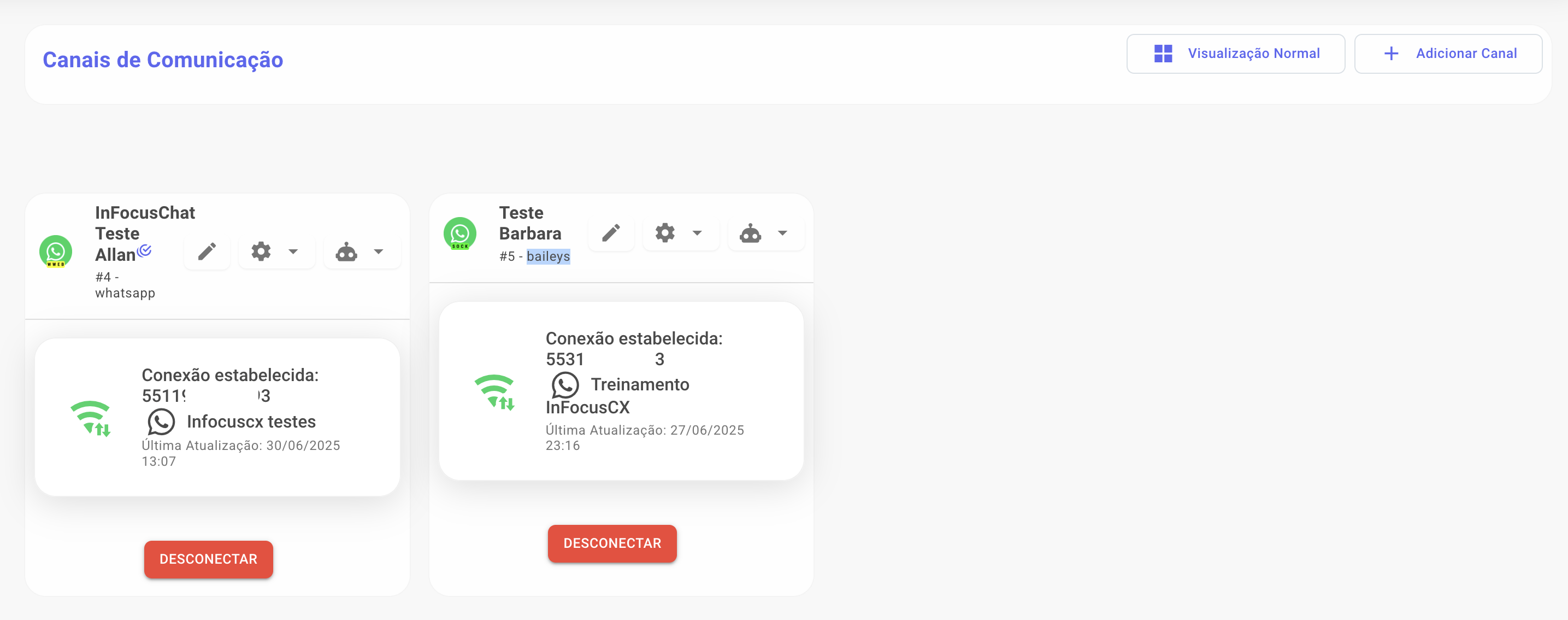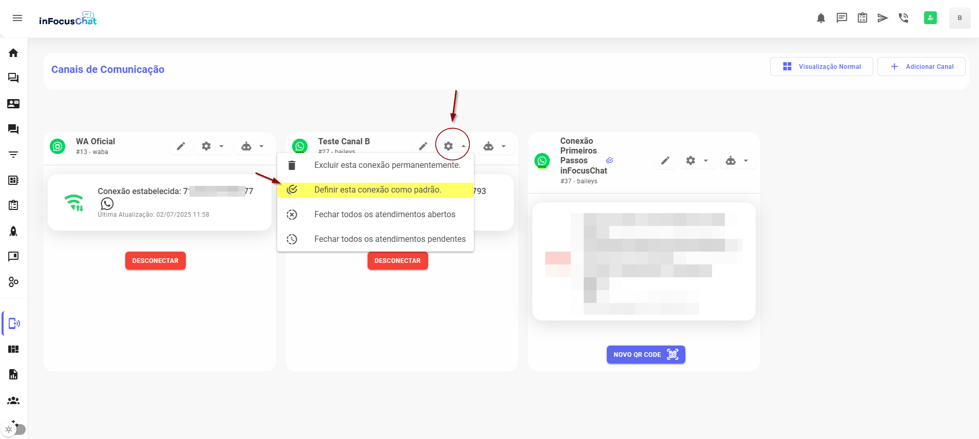 6) O inFocusChat considera um canal padrão em algumas rotinas como validação de contatos. Mantenha ele sempre conectado. O canal padrão será identificado pelo check duplo, ao lado do nome.