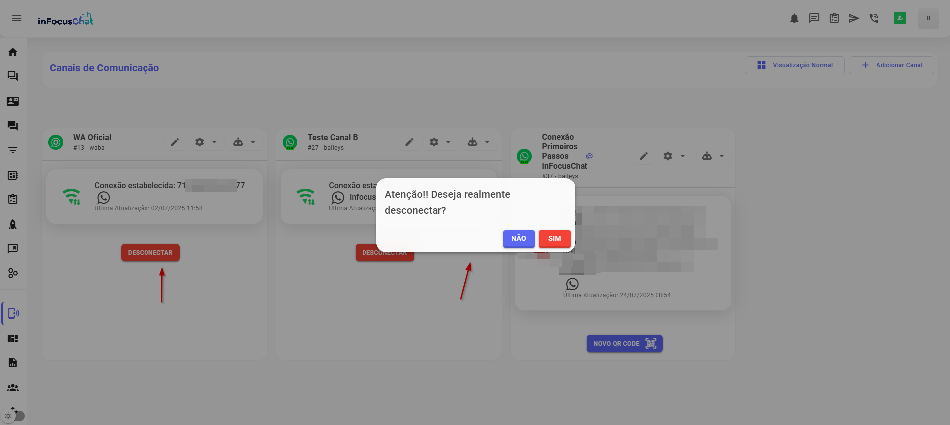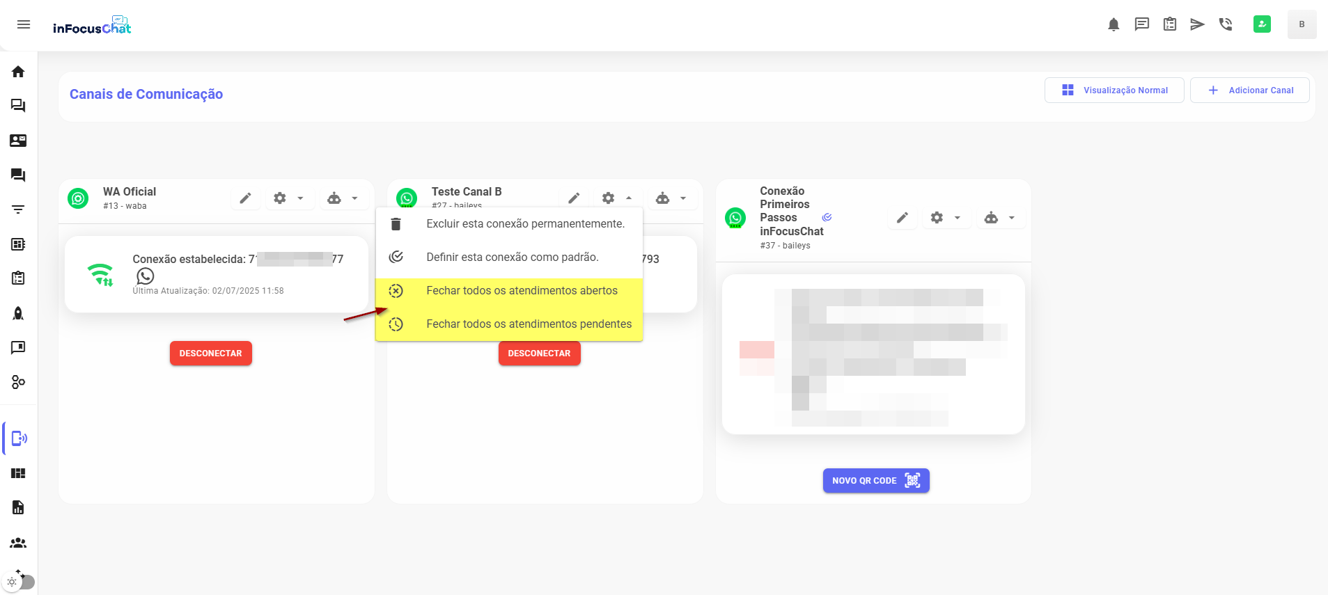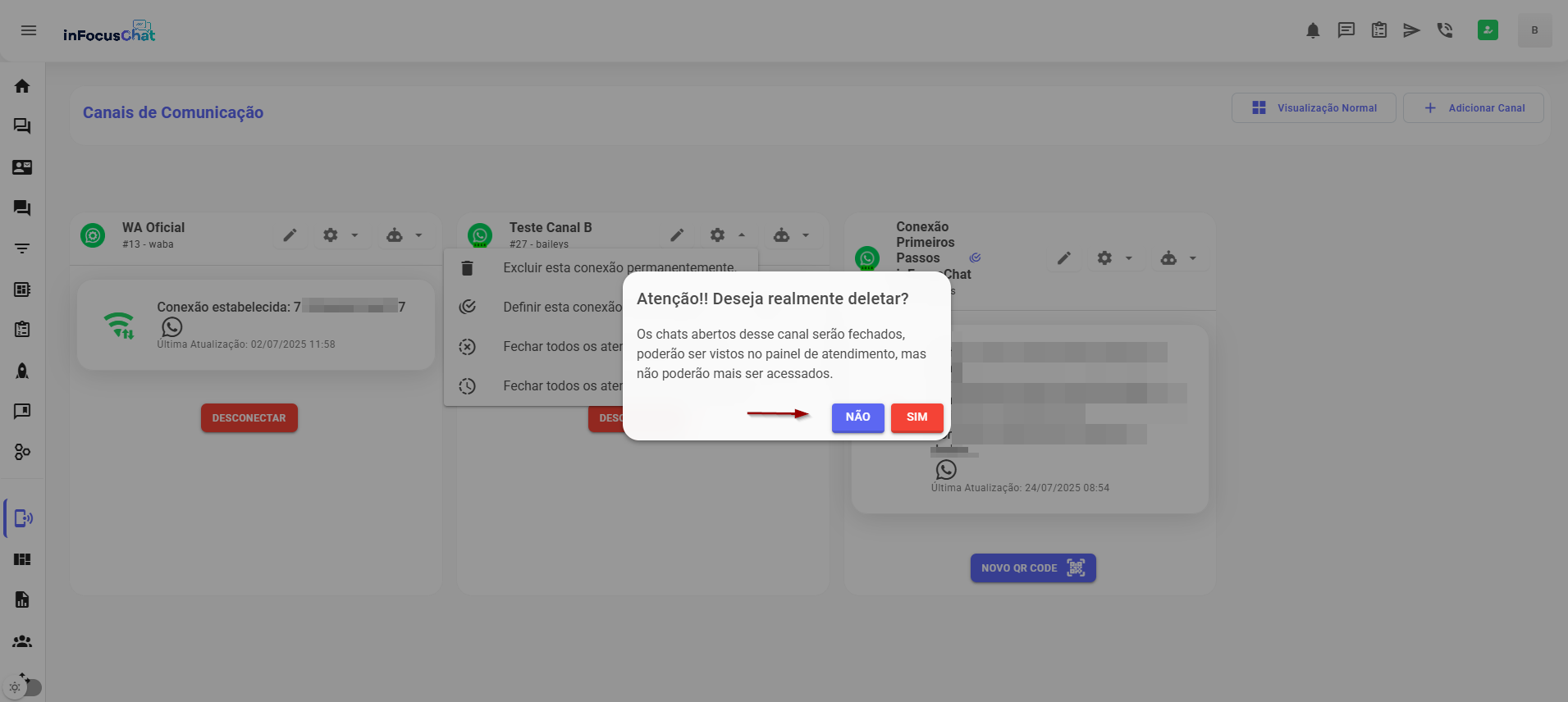 6) O inFocusChat considera um canal padrão em algumas rotinas como validação de contatos. Mantenha ele sempre conectado. O canal padrão será identificado pelo check duplo, ao lado do nome.