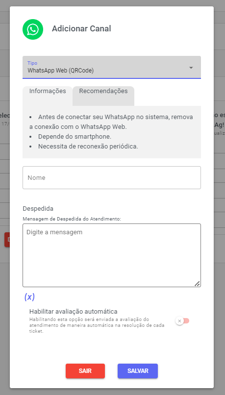 ▪️Tipo: Escolha entre WhatsApp Oficial (WABA), WhatsApp Web (QRCode), Telegram, Hub Notificame, Evolution, Wuzapi ou Webchat.