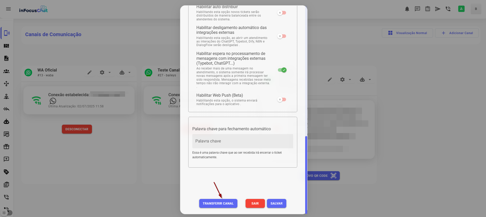 3) Ao clicar em editar, um pop-up com as configurações do seu canal será exibido. Mova a barra de rolagem até visualizar o botão Transferir canal. Ao clicar em transferir canal, dele você poderá transferir os atendimentos entre canais