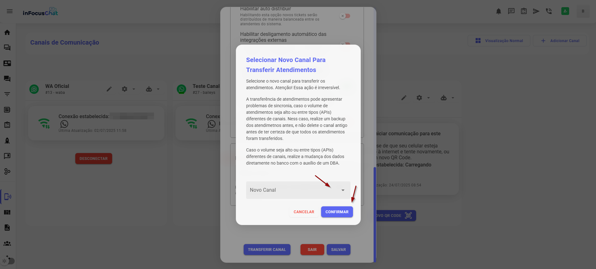 4) Ao clicar em Transferir Canal, uma nova tela será exibida, para que você possa selecionar o canal de destino. Clique em confirmar.