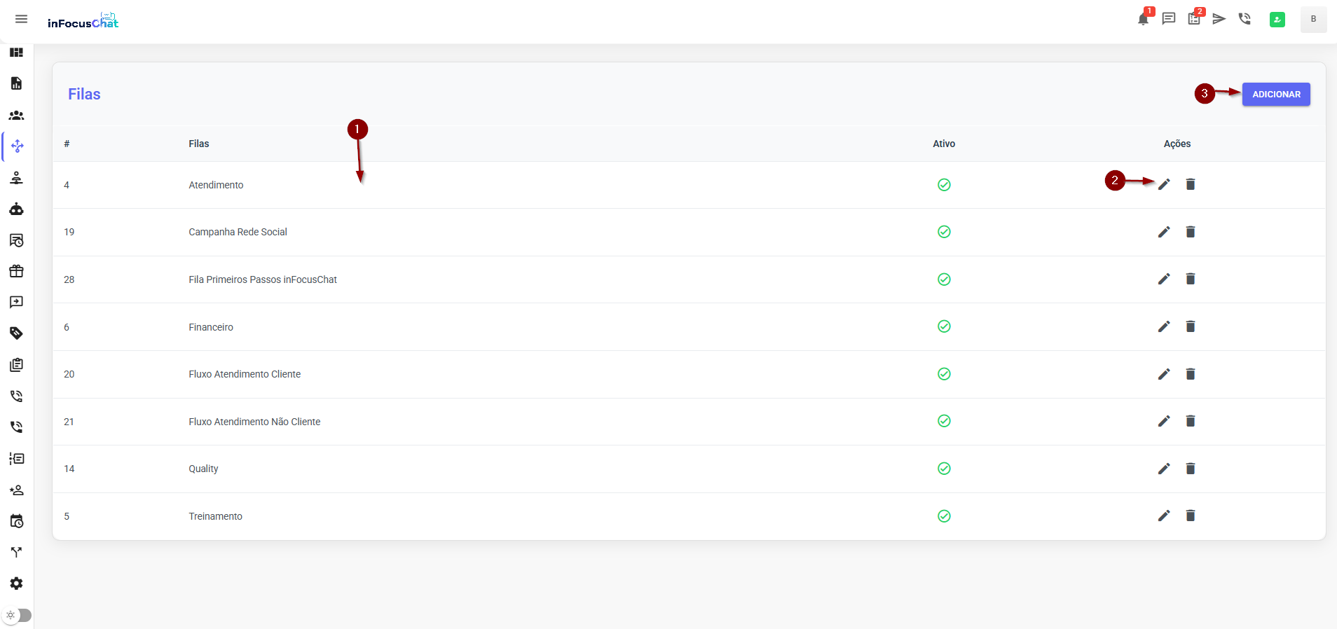 2) Na tela principal serão listadas as filas cadastradas (1), a coluna com opções de ações (2) e o botão adicionar (3).