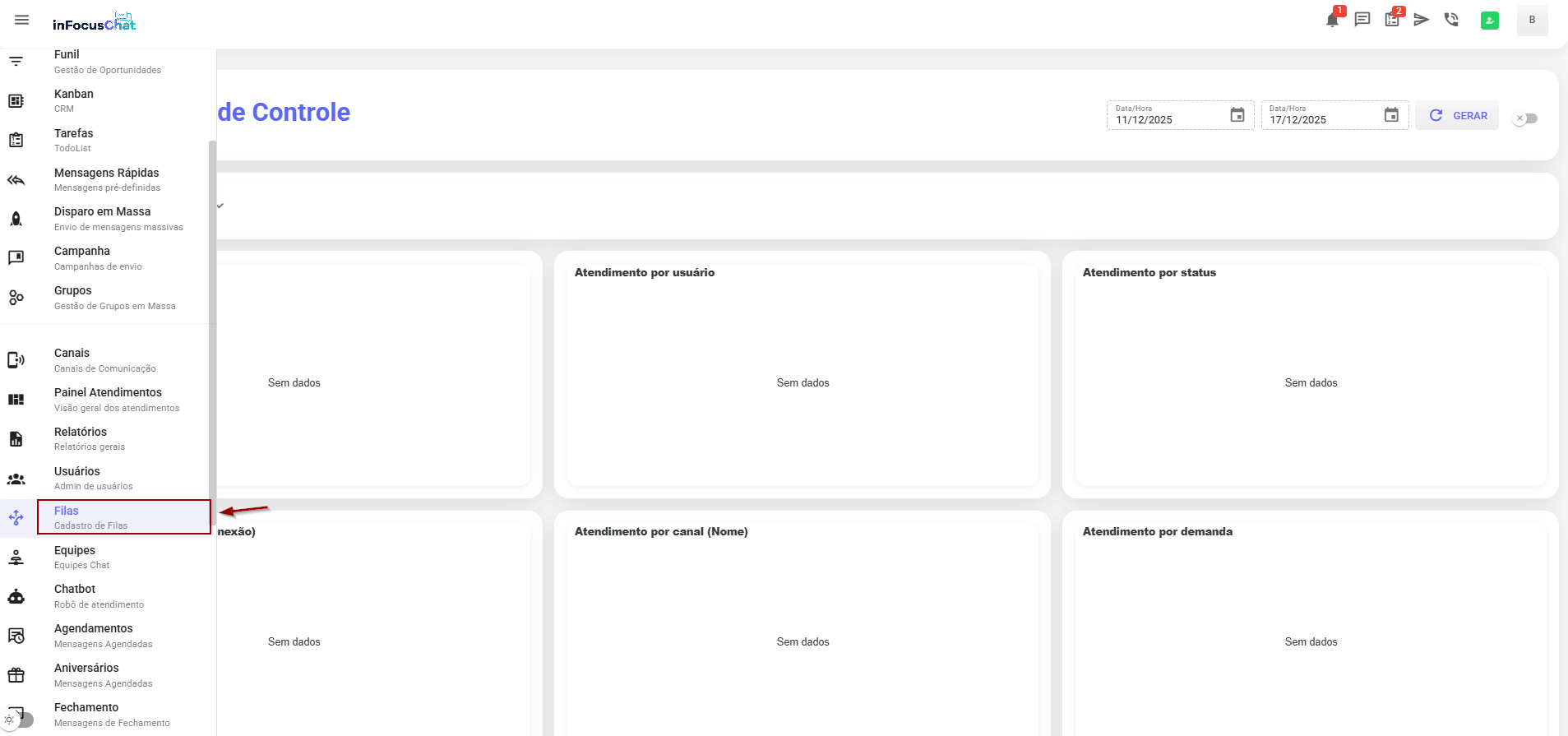 Esse recurso pode ser acessado apenas pelos perfis Administradores e Supervisores do inFocusChat. Veja os detalhes desse menu: