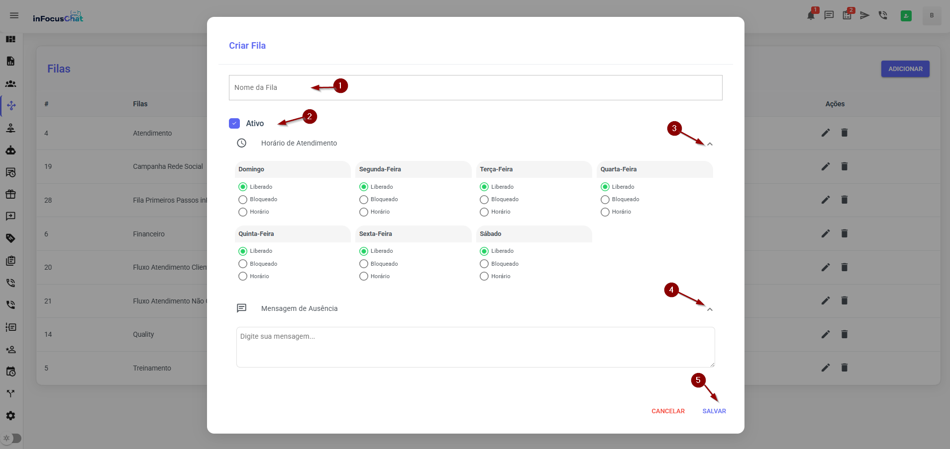 3) Ao clicar em Adicionar no canto superior da tela, será exibida a tela para indicação do nome (1), ativação da fila (2), definição do horário de atendimento (3), mensagem de ausência (4) e a confirmação das alterações (5). A nova fila criada será exibida na página inicial do menu.
