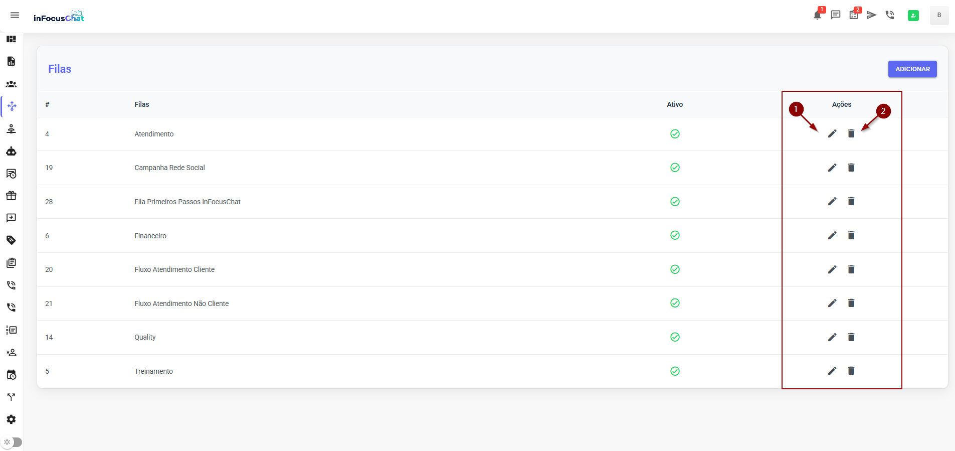 4) Para editar as filas existentes, utilize as opções editar (1) e excluir (2) exibidas na coluna Ações.